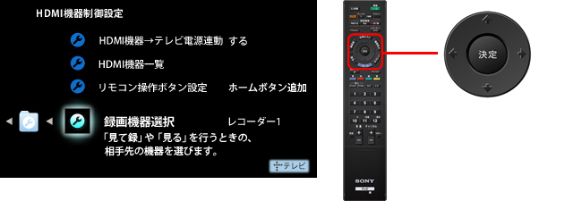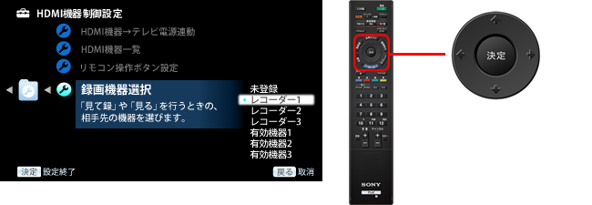 ブルーレイディスクレコーダー(HDD/BD)ホームシアターシステム/シアタースタンドシステム(SOUND SYSTEM)が一覧に表示されていればHDMI機器制御が有効になっています。 このとき〈機器〉の欄に表示されている録画機器名(「レコーダー1」など)を確認してください。
