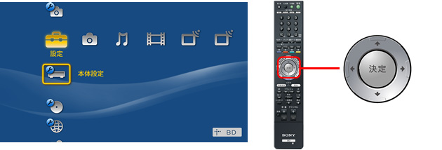 ブルーレイディスクレコーダーに付属のリモコンの←→で[設定]を選び、↑↓で[本体設定]を選び「決定」ボタンを押します。