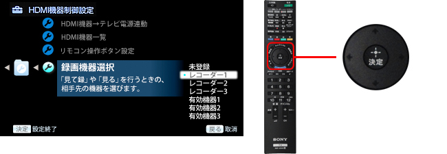 ブルーレイディスクレコーダー(HDD/BD)が一覧に表示されていない場合は、「決定」ボタンを押して、つないだ機器のHDMI機器制御を有効にして下さい。「決定」ボタンを押しても一覧に表示されない場合は、つないだ機器の取扱説明書をご覧になり必要に応じて設定してください。