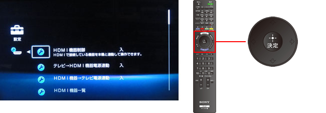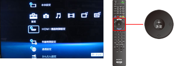 リモコンの←→で[設定]を選び、↑↓で[HDMI機器制御設定]を選び「決定」ボタンを押します。