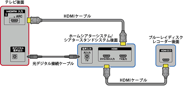 Audio Return Channel(ARC)に対応しているオーディオシステムと接続する場合、HDMIケーブルをテレビ後面の「HDMI1 入力端子」につなげば、光デジタル接続ケーブルは必要ありません。