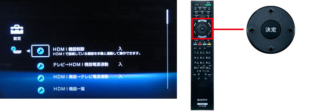 リモコンの←→で[設定]を選び、↑↓で[HDMI機器制御設定]を選び「決定」ボタンを押します。