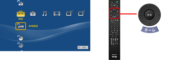 ブルーレイディスクレコーダーに付属のリモコンの←→で[設定]を選び、↑↓で[本体設定]を選び「決定」ボタンを押します。