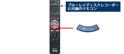 「ホーム」ボタンを押して、ブルーレイディスクレコーダーのホームメニューを表示し、←→↑↓ボタンで操作をします。