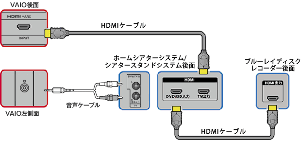 Audio Return Channel(ARC)に対応しているオーディオシステムと接続する場合、HDMIケーブルをVAIO後面の「HDMI INPUT端子」につなげば、音声ケーブルは必要ありません。