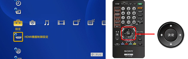 マルチリモコンの←→で[設定]を選び、↑↓で[HDMI機器制御設定]を選び「決定」ボタンを押します。