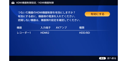 「有効にする」ボタンを押すと、テレビ側で再度HDMI機器の接続を確認します。 |