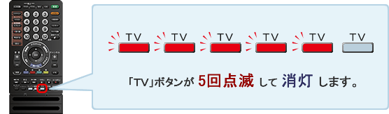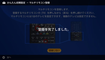 マルチリモコンの「TV」ボタンを押したまま、「戻る」ボタンを押し続けます。テレビ画面に「登録を完了しました」と表示すれば登録完了です。
