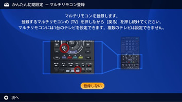 マルチリモコンの「TV」ボタンを押したまま、「戻る」ボタンを押し続けます。テレビ画面に「登録を完了しました」と表示すれば登録完了です。