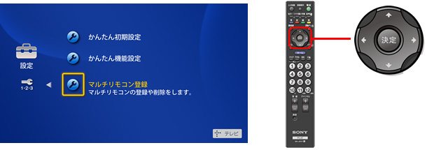 テレビ本体、またはシンプルリモコンの↑↓で[マルチリモコン登録]を選び、「決定」ボタンを押します。