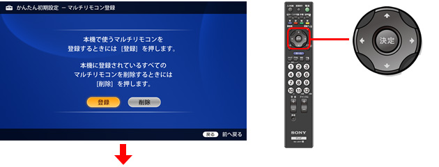 シンプルリモコンまたは、テレビ本体にある [決定] ボタンを押すと [登録しない] が選ばれてしまいますので、ご注意ください。[登録しない]にしてしまった場合、シンプルリモコンまたは、テレビ本体にある [←] ボタンを押して戻ってください。