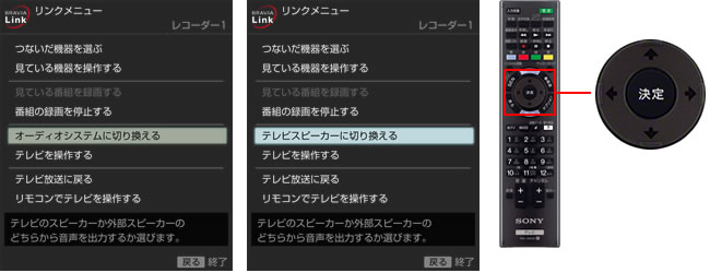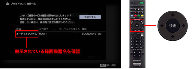 ホームシアターシステム/シアタースタンドシステム(AV AMP、SOUND SYSTEMなど)が一覧に表示されていない場合は、「決定」ボタンを押して、つないだ機器のブラビアリンク(HDMI機器制御)を有効にして下さい。「決定」ボタンを押しても一覧に表示されない場合は、つないだ機器の取扱説明書をご覧になり必要に応じて設定してください。