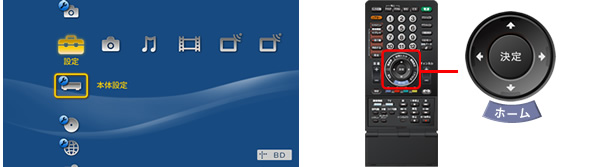 シンプルリモコンの←→で[設定]を選び、↑↓で[本体設定]を選び「決定」ボタンを押します。