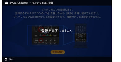 誤って[登録しない]を選んだ場合は、「かんたん初期設定」完了後、テレビ本体の「ホーム」ボタンを押し[設定]→[かんたん設定]→[マルチリモコン登録]の順に進んで「マルチリモコン登録画面」を表示し、下記の手順で登録してください。