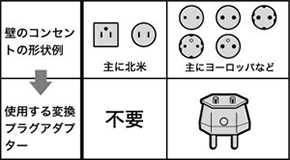取扱説明書の内容をよくお読みください。電源コンセントの形状の異なる国や地域では、電源コンセントに合った変換プラグアダプターをあらかじめ旅行代理店でおたずねの上、ご用意ください。電子式変圧器(トラベルコンバーター)は使わないでください。故障の原因となることがあります。