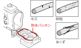 水中・水辺で使用する前には、防水パッキンや防水パッキンの当たる面に傷やゴミ、砂粒、毛髪、ほこり、塩、糸くずなどが付着していないかを充分確認し、ある場合は柔らかい布で必ず取り除いてください。正しく取り扱わないと、水没の原因となります。