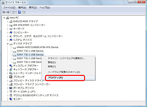 [ SONY TJS-1 USB Device ] の1つを右クリックして、 [ プロパティ ] を選択します。