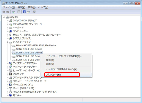 [ SONY TJS-1 USB Device ] の1つを右クリックして、 [ プロパティ ] を選択します。