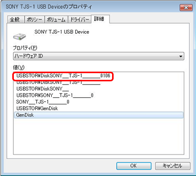 [ SONY TJS-1 USB Deviceのプロパティ ] の画面で [ 詳細 ] を選択します。