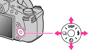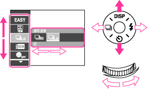 (フラッシュ)の機能が割り当てられています。各アイコン方向を押すことで、その機能選択画面に移行します。