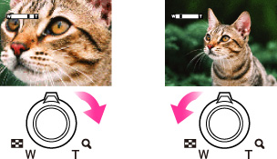 T側にレバーを動かすとズームし、W側にレバーを動かすと戻る。