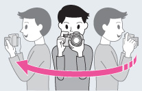 体を軸に、カメラを一定の速度でゆっくり回す(半周5秒が目安です)。速すぎたり遅すぎたりするときは、液晶画面にメッセージが表示されます。実際の撮影の前にあらかじめ何度か練習しておくことをおすすめします。3D撮影には止まっている被写体が適しています。