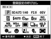 (登録設定の呼び出し)を行うと、呼び出された[設定を登録]の値が優先され、最初に行った設定が無効になる場合があります。画面で設定値を確認してから撮影してください。