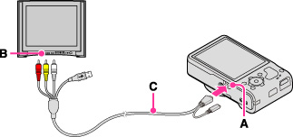 本機のマルチ端子(A)とテレビの映像/音声入力端子(B)をUSB/AV/DC INマルチ端子ケーブル(別売)(C)で接続する