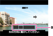 スイングパノラマ撮影のポイント一定の速度で小さな円を描くように動かし、液晶画面の矢印方向と平行に動かしてください。動いている被写体よりも、止まっている被写体のほうがパノラマ撮影には適しています。