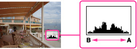 ヒストグラムは、明るさを示すグラフです。表示が右寄りなら明るめの画像(A)、左寄りなら暗めの画像(B)です。