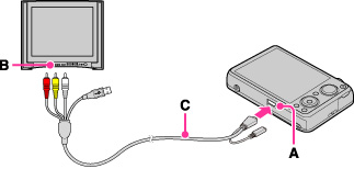 本機のマルチ端子(A)とテレビの映像/音声入力端子(B)をUSB/AV/DC INマルチ端子ケーブル(別売)(C)で接続する