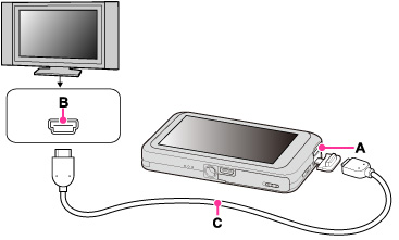 本機のHDMI端子(A)とテレビのHDMI端子(B)をHDMIケーブル(別売)(C)で接続する