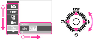 (連写設定)の機能が割り当てられています。各アイコン方向を押すことで、その機能選択画面に移行します。