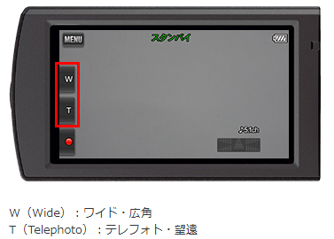 ズームにはズームイン(被写体に近づいていく)、ズームアウト(被写体から遠ざかっていく)の2種類があります。ズームレバーの操作に慣れないうちは、ズームが早すぎたり遅すぎたり、ぎこちない動きになりがちです。時間のあるときに練習しておくとよいでしょう。液晶画面内左端に表示される「W」「T」を利用すると、「W」または「T」を押している間一定の速さでズームされますので、滑らかにズームをすることができます。