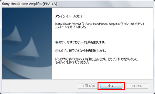 - アンインストールが完了しましたので、「完了」をクリックして再起動します。
