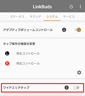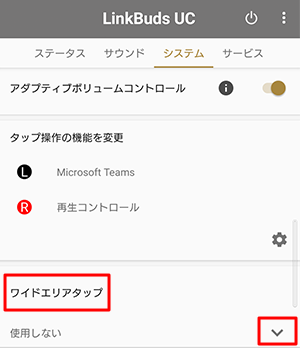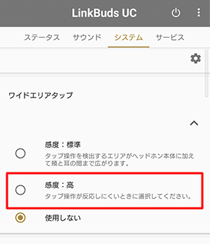 * LinkBuds UCでは、[ワイドエリアタップ]をタップし、[感度:標準]を選択してください。(お使いいただき、必要があれば感度を調節してください)