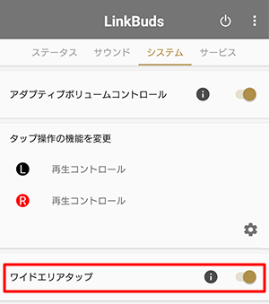 Headphones Connectの画面で、[ワイドエリアタップ]を有効にする