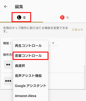 L(左)を選択し、「機能」のプルダウンリストから[音量コントロール]を選択する