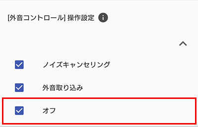 Sound Connectアプリの[外音コントロール]操作設定で、[オフ]機能にチェックを入れることで、外音取り込み機能、ノイズキャンセリング機能に加えて、両方の機能をオフにできる選択が可能になります。