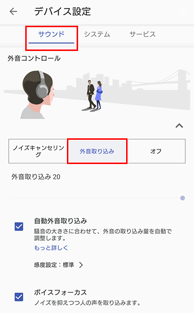 Sound Connectアプリで、自動外音取り込みのオン/オフの切り替えや、感度設定の変更ができます。