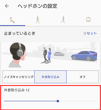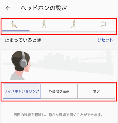 (設定)アイコンを選択すると、4つの行動シーンごとにノイズキャンセリングや外音取り込みを設定することが可能です。