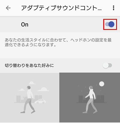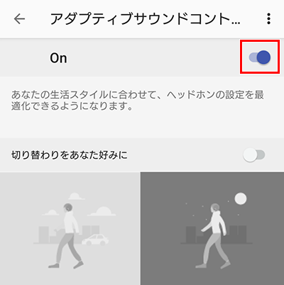 アダプティブサウンドコントロールをオフにすることで、行動シーンを自動で検知されなくなるため、好きなタイミングでノイズキャンセリング/外音取り込みの切り替えを行うことができます。