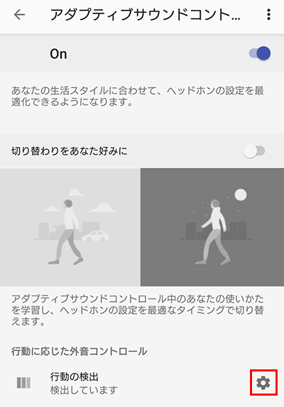 アダプティブサウンドコントロールとは、止まっている、歩いている、走っている、電車に乗っているなどの行動シーンに応じて、ノイズキャンセリング/外音取り込みレベルが自動的に切り替わる機能です。