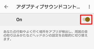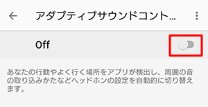 アダプティブサウンドコントロールをオフにすることで、行動シーンを自動で検知されなくなるため、好きなタイミングでノイズキャンセリング/外音取り込みの切り替えを行うことができます。