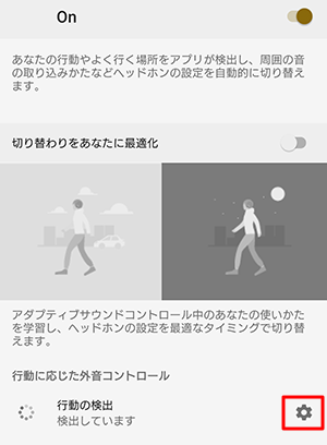 アダプティブサウンドコントロールとは、止まっている、歩いている、走っている、電車に乗っているなどの行動シーンに応じて、ノイズキャンセリング/外音取り込みレベルが自動的に切り替わる機能です。