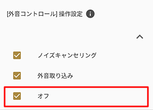Headphones Connectアプリの[外音コントロール]操作設定で、[オフ]機能にチェックを入れることで、外音取り込み機能、ノイズキャンセリング機能に加えて、両方の機能をオフにできる選択が可能になります。