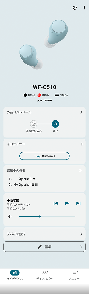 画面上部中央に現在接続しているヘッドホンの製品イメージと製品型名、その下に電池残量、Bluetooth接続コーデック名、DSEE(Onに設定時)が表示されます。