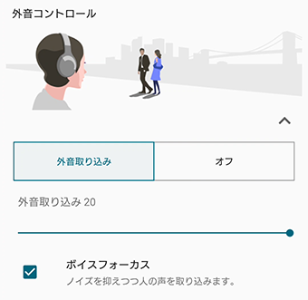 [ボイスフォーカス]にチェックをいれると、騒音は押さえつつアナウンスや人の声のみを取り込み、音楽と一緒に聞こえるようにすることができます。