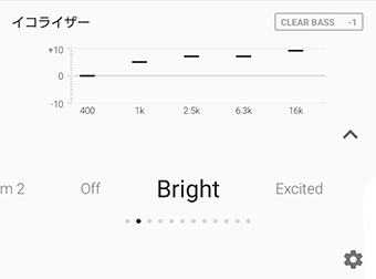 ホーム画面から「イコライザー」を選ぶと、Bright/Excited/Mellow/Relaxed/Vocal/Treble Boost/Bass Boost/Speechの8種類のプリセットからお好みのエフェクトを選べます。
