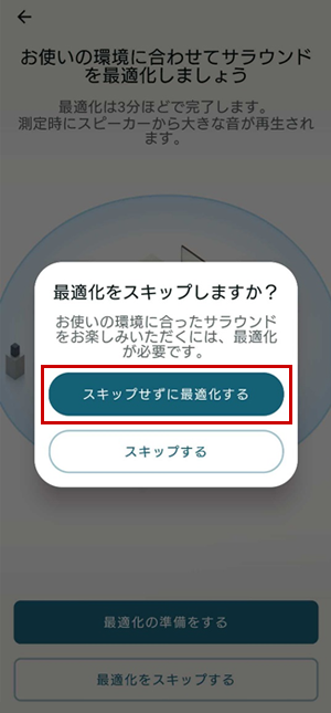 「使いの環境に合わせてサラウンドを最適化しましょう」の画面が表示されたら [OK] をタップし、画面に従いいつも音声を聴く場所(設置した部屋のソファなど)に移動し、[次へ] をタップします。